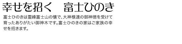 富士山を祀る浅間神社の御祭神である木花之佐久夜毘売命(このはなのさくやひめみのこと)は、大山祇神(おおやまづみのかみ)の御息女で、大変な美貌の持ち主でした。高天原より降臨した天孫瓊々杵尊(ににぎのみこと)の心をとらえ、皇后となりましたが、ご懐妊の際、貞節を疑われたことを悲しみ、その証を立てるため、産屋の周りに火を放ちご出産になられました。そして無事三人の皇子を生まれたという故事にちなみ、火難消除・安産等の御神徳ある神様として全国に多くの崇敬者を持ちます。 富士山の懐で育った富士ひのきで家を建てると、こうした神様の御神徳に守られて毎日を過ごす事となります。 家内円満でしあわせな毎日を送れるにちがいありません。